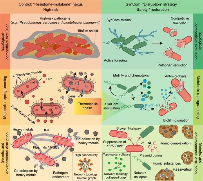 Furthermore, the rapid decrease in the carbon-to-nitrogen ratio and the enhanced humification driven by SynCom effectively alleviated the co-selection pressure on metal resistance genes. Additionally, the structural collapse of high-risk interaction networks (with potential host-gene associations reduced by 26.6%) effectively severed the connections between ARGs and mobile genetic elements, and synchronously eliminated high-risk pathogens such as Pseudomonas aeruginosa.
